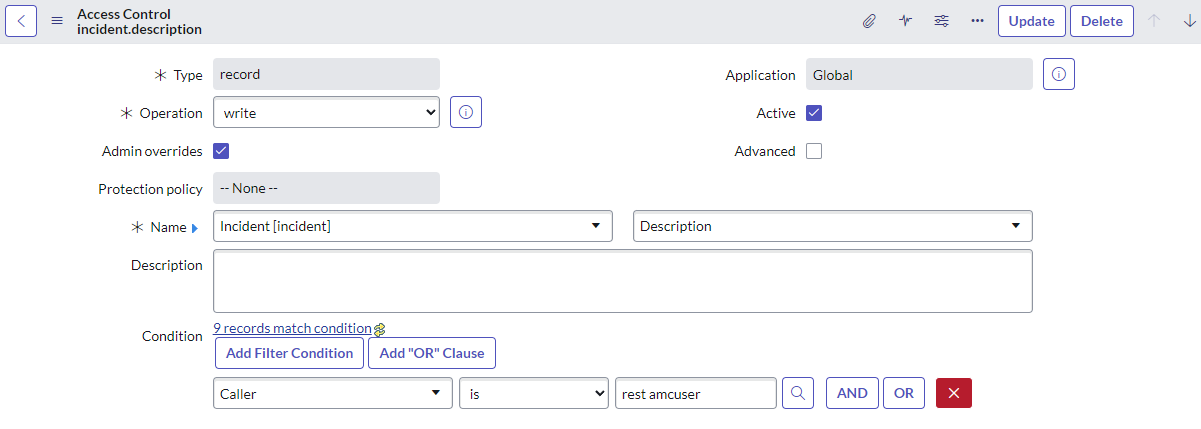 ここではインシデントテーブルのDescriptionに書き込む(write)権限を、rest.amcuserユーザに付与するルールを作成します。