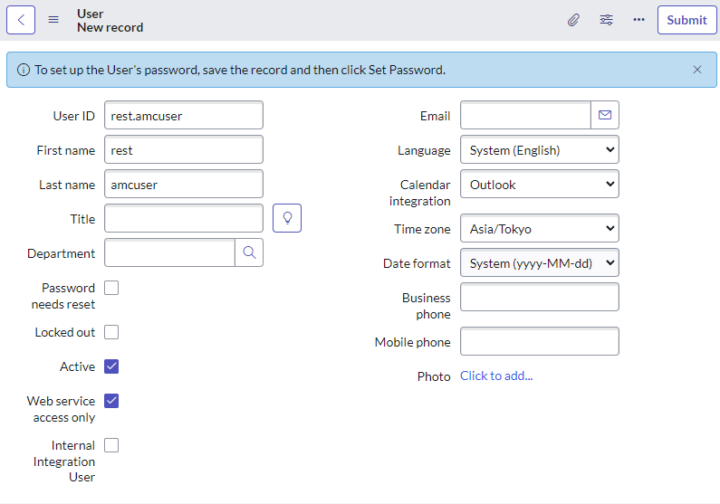 WebSAM Cloud 通報サービスから送信されるWebhookを受信するためのユーザをServiceNowに作成します。