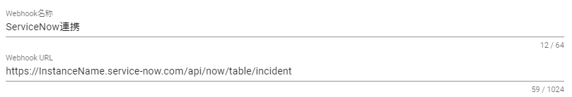 [Webhook名称]には識別しやすい名前を入力し、[WebhookURL]に、ServiceNowのテーブルAPIのURLを入力します。