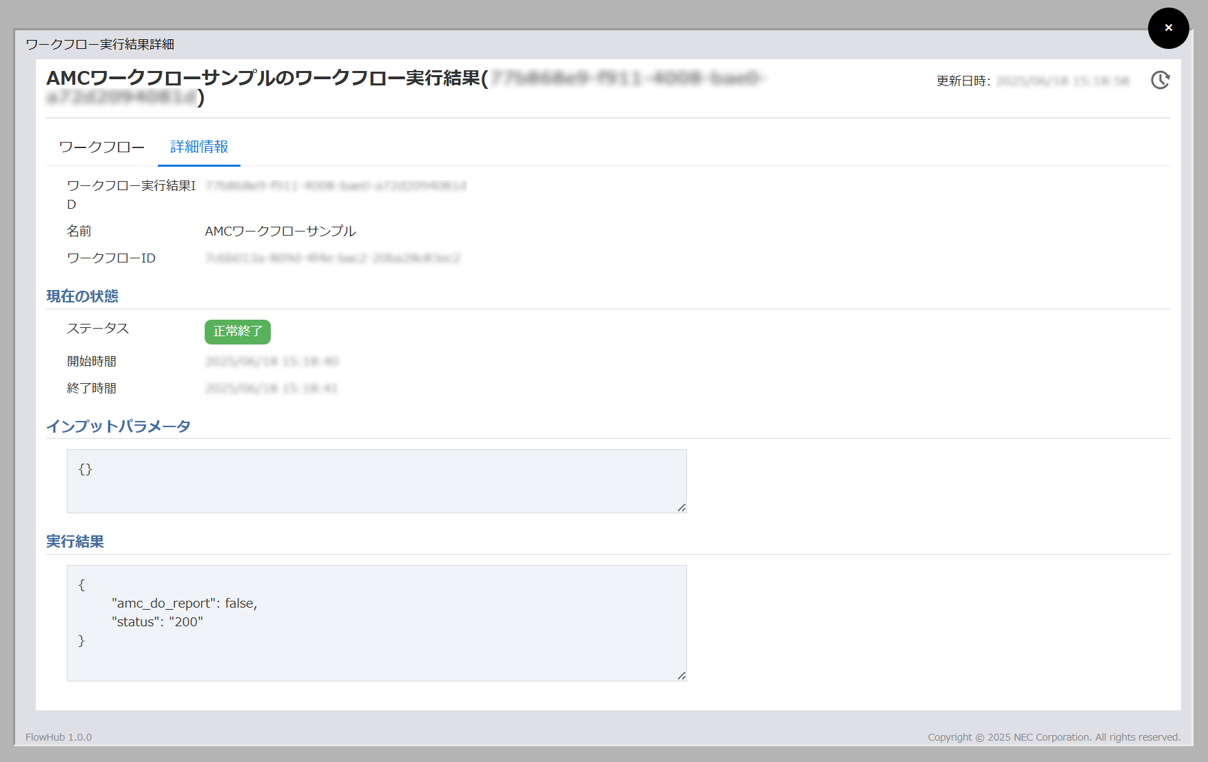 「詳細情報」タブでは、フローへのインプットパラメータやノードごとの出力内容を確認できます。
