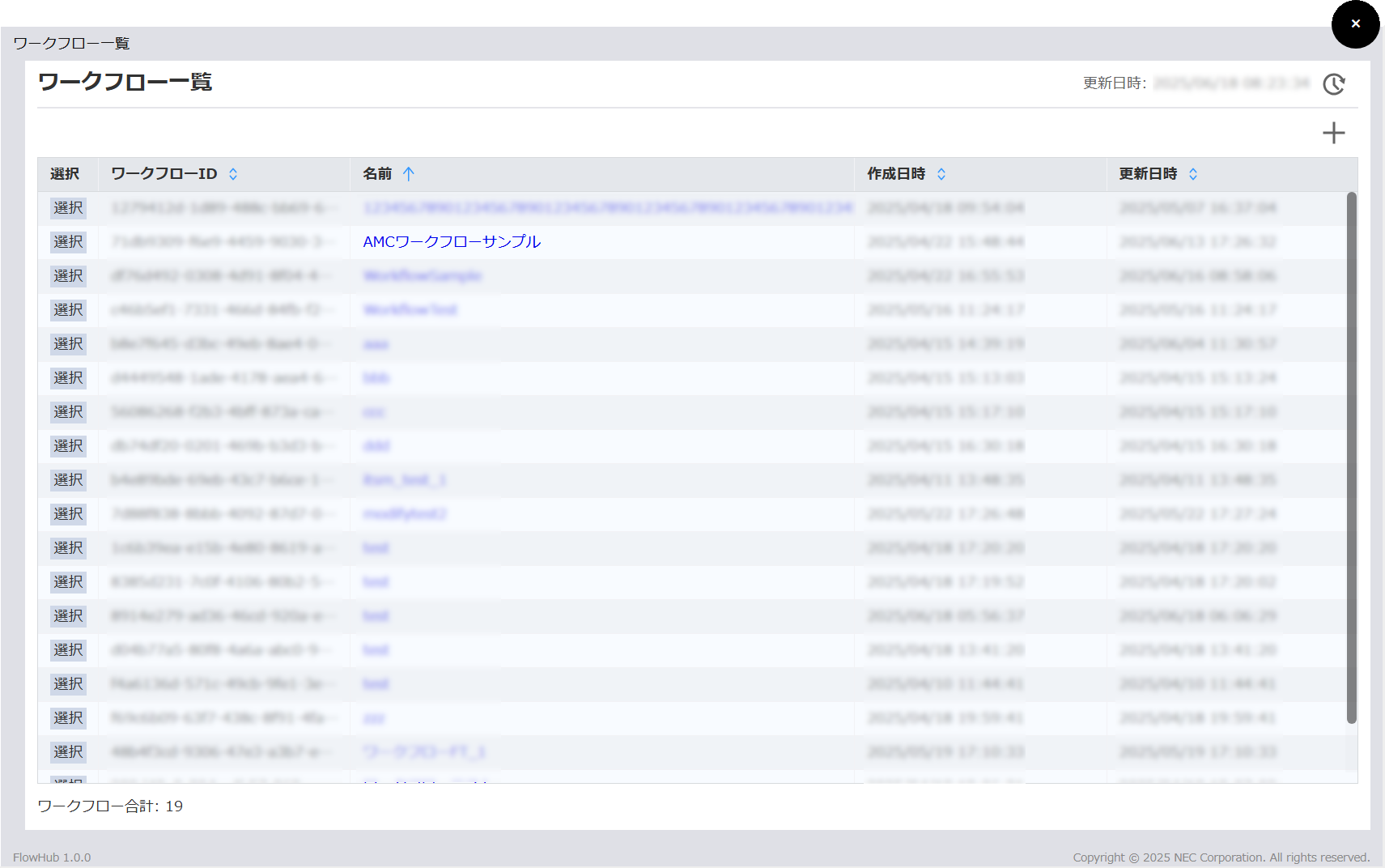 ワークフロー一覧画面が開きます。右上の + ボタンをクリックして新規作成画面へ進みます。